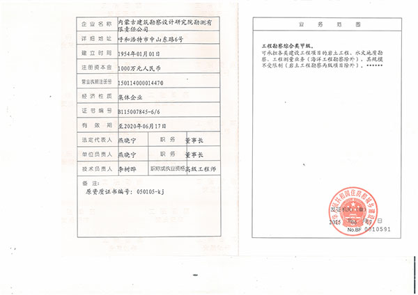 • 內蒙古建筑勘察設計研究院勘測有限責任公司,是全國首家完成 轉企建制的省級建筑勘察設計單位。公司前身為內蒙古建筑勘察 設計研究院勘測分院, 成立于1954年 ,經過六十多年的發展, 現已成為全區技術力量雄厚、專業設置齊全的集巖土工程勘察 、 設計、治理、檢測、監理、咨詢、水文地質勘查、工程測量、科 研為一體的綜合性企業 ... ... [查看詳情]